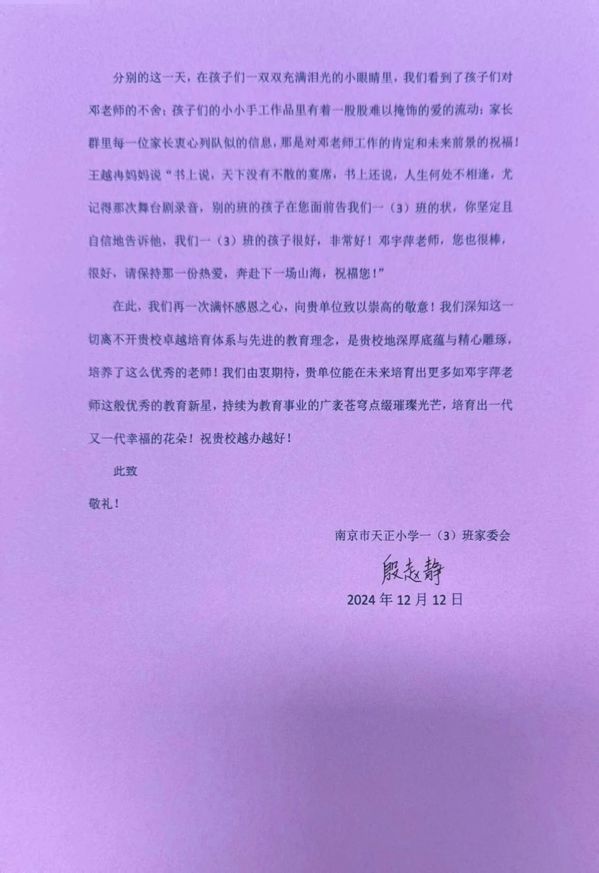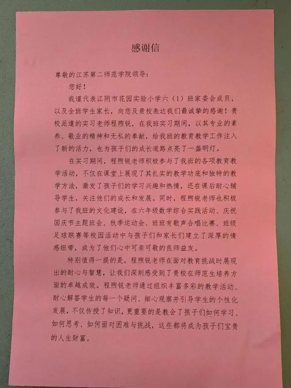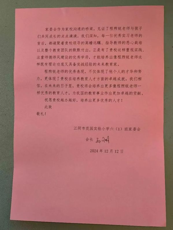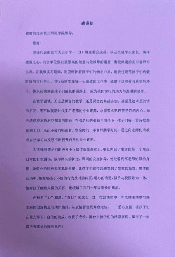 在教育实习的舞台上,我院学生始终以卓越的专业素养和热忱的教育情怀,积极投身于教学实践与班级管理工作,倾心助力学生成长成才,执着追求教育梦想绚烂绽放。近日,崇德书院喜获两封实习感谢信,2025届毕业生程熙锐和邓宇萍在实习学校的优异表现,赢得了所管理班级家委会的高度认可和充分赞扬,彰显出学院教育理念与实践成果的完美融合与积极影响力。