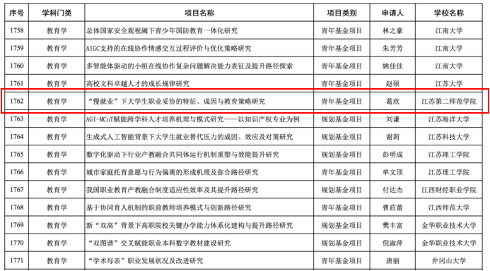 近日,2025年教育部人文社科研究项目评审结果公示,我院葛欣老师主持的“‘慢就业”下大学生职业妥协特征、成因与教育策略研究”获青年基金项目立项,杨杰副教授主持的“吴之英《仪礼奭固礼事图》整理与研究”获规划基金项目立项。