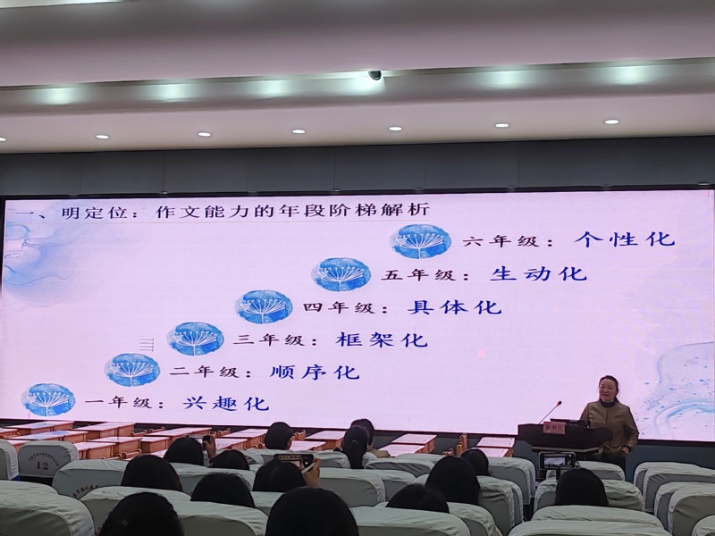 活动伊始,石湫中心小学的张美英、王宇寒两位教师分别进行了“我来编童话”主题习作课的同课异构,以“搭建故事框架、释放想象活力”为核心,呈现互动式课堂的实践样态。接着,简中兰老师结合自身三十年小学语文教学与研究经验,围绕“明定位、析学情、练观察、找方法、破难点”五大维度,为在场师生提供起步作文教学的“实操指南”。此外,简老师还结合教材中的八次习作训练,强调“阶梯式设计”的重要性:“每次训练要有明确目标,比如第一次练‘写清楚故事要素’,第二次练‘加入对话’,逐步叠加技巧,让学生在实践中扎实掌握方法。