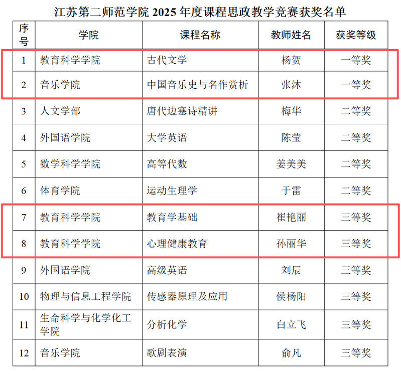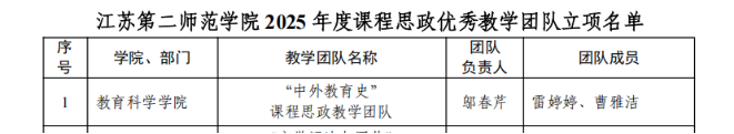 近日,江苏第二师范学院2025年度课程思政示范项目评选结果揭晓,经个人申报、学院部门推荐、专家组评审、结果公示,在课程思政教学竞赛单元评选出的12个奖项中,我院杨贺老师获得一等奖,崔艳丽、孙丽华两位老师获得三等奖;在课程思政优秀教学团队评选单元,由邬春芹、雷婷婷、曹雅洁三位老师组成的“中外教育史”课程思政教学团队获得校课程思政优秀教学团队。