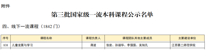 近日,教育部发布第三批国家级一流本科课程认定结果公示,我院蒋波院长带领团队开设的《儿童发展与学习》课程成功入选。