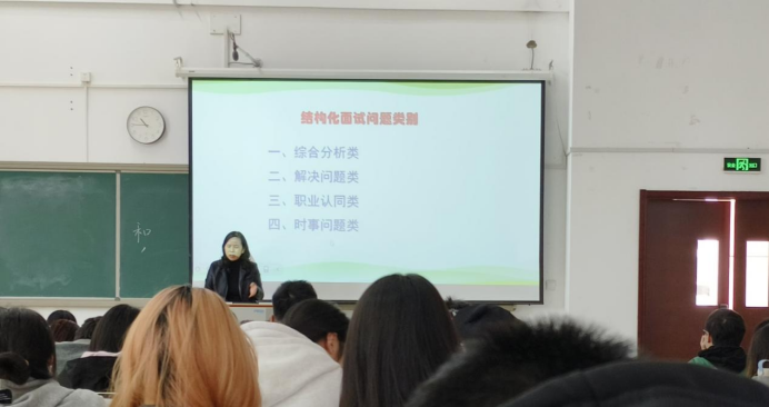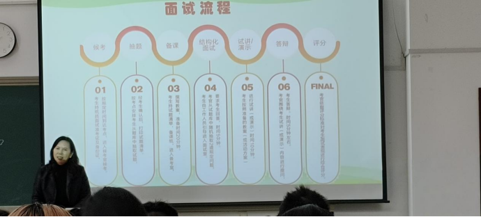 讲座开篇,吴如萍老师以教资面试流程为切入点,清晰拆解各环节核心要点,并明确不同步骤的分值权重,引导同学们精准把握备考重心,避免盲目复习。随后,老师围绕面试礼仪与表达规范展开讲解,从着装搭配的专业性到语言表达的逻辑性与流畅度,逐一给出具体建议,启示同学们以“冷静客观、积极向上”的态度从容应对面试。
