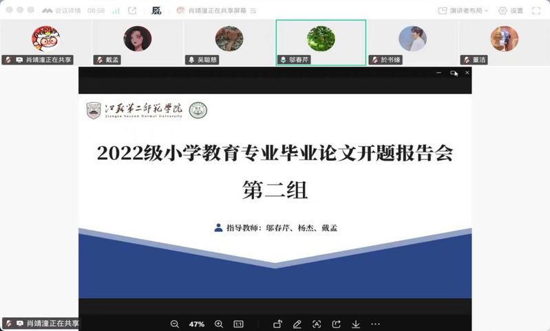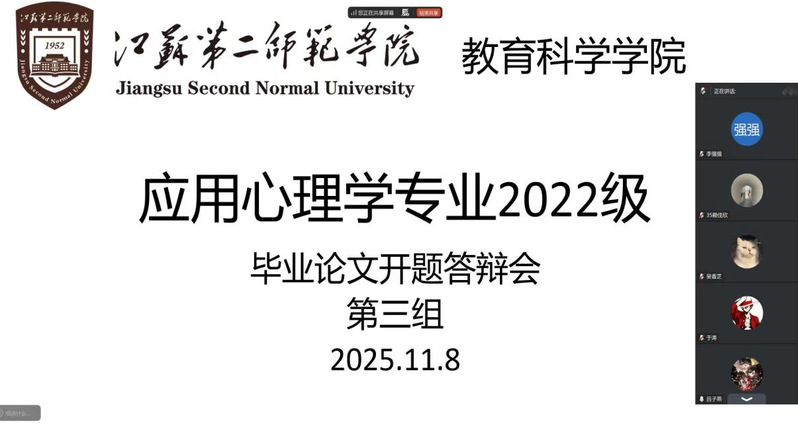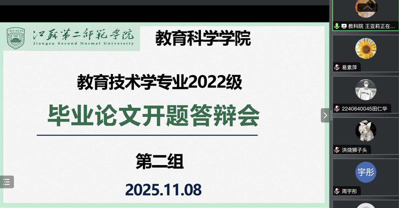2025年11月1日至9日,教育科学学院举行了2026届本科生毕业论文开题报告会。本次开题答辩以线上的方式展开,共设置16个开题小组。教育科学学院全体教师分别担任各组评委,围绕论文选题价值、研究方案、研究可行性等核心维度,为2026届本科生毕业论文的顺利进行保驾护航。