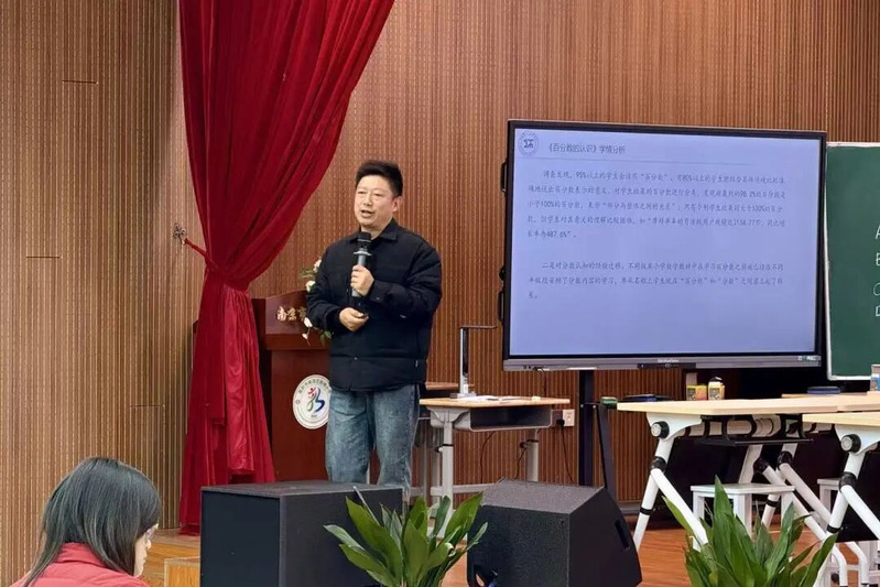 示范课结束后,专家围绕教学核心展开指导与分享。张晓辉副主任紧扣《百分数的认识》一课核心、依标教学展开分享,先对比2016版与2022版课标对百分数的要求,引导教师探究百分数的分类与意义,感受其统计意义以形成数据意识和初步应用意识;再深入剖析百分数作为“数与代数”核心概念的特征,厘清确定数据与随机数据的区别,明晰百分数的统计计量价值;最后聚焦数据意识培养,提出通过分析数据制造认知冲突、激发学习需求,借助多元表征理解意义、辩证分析数据的教学建议。讲座既有课标对比的理论高度,又有落地课堂的实操方法,让在场教师对百分数教学乃至高年段数学教学形成了系统且深刻的认知。